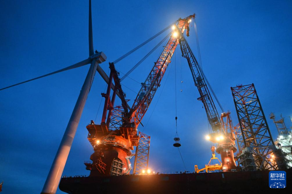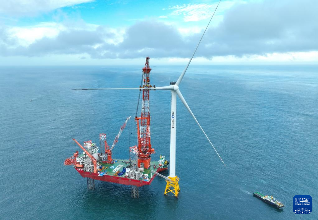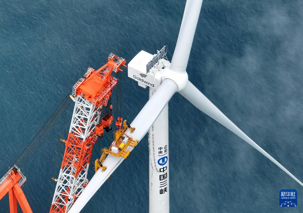 6月19日拍摄的三峡集团漳浦二期海上风电项目最后一台16兆瓦海上风电机组叶片安装现场(无人机照片)。新华社记者 林善传 摄