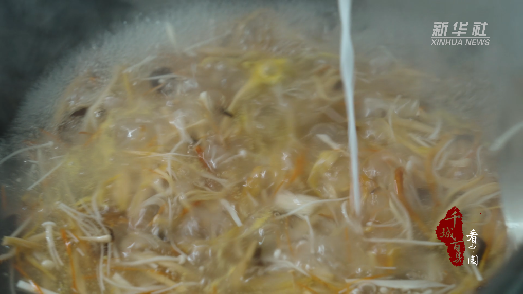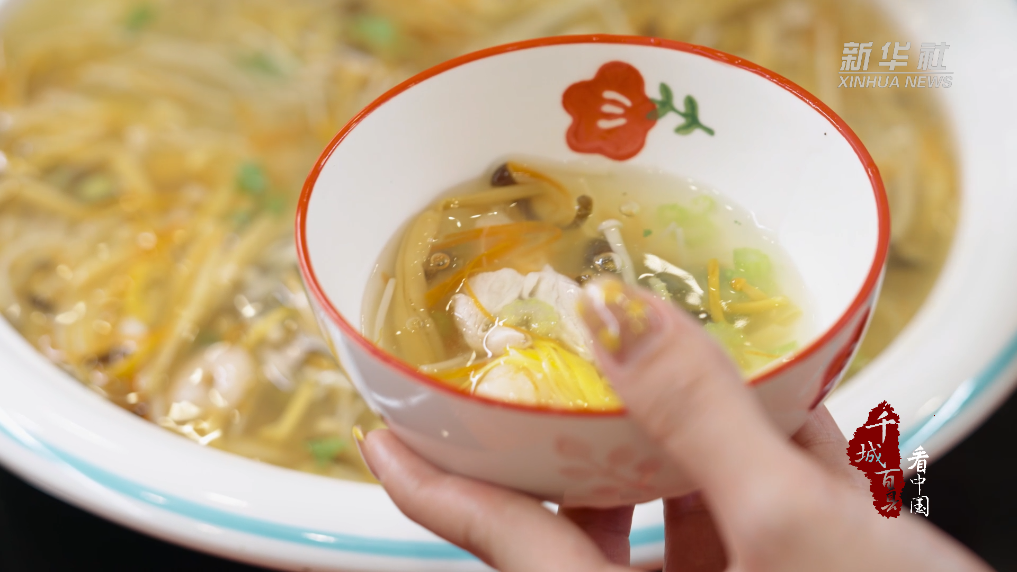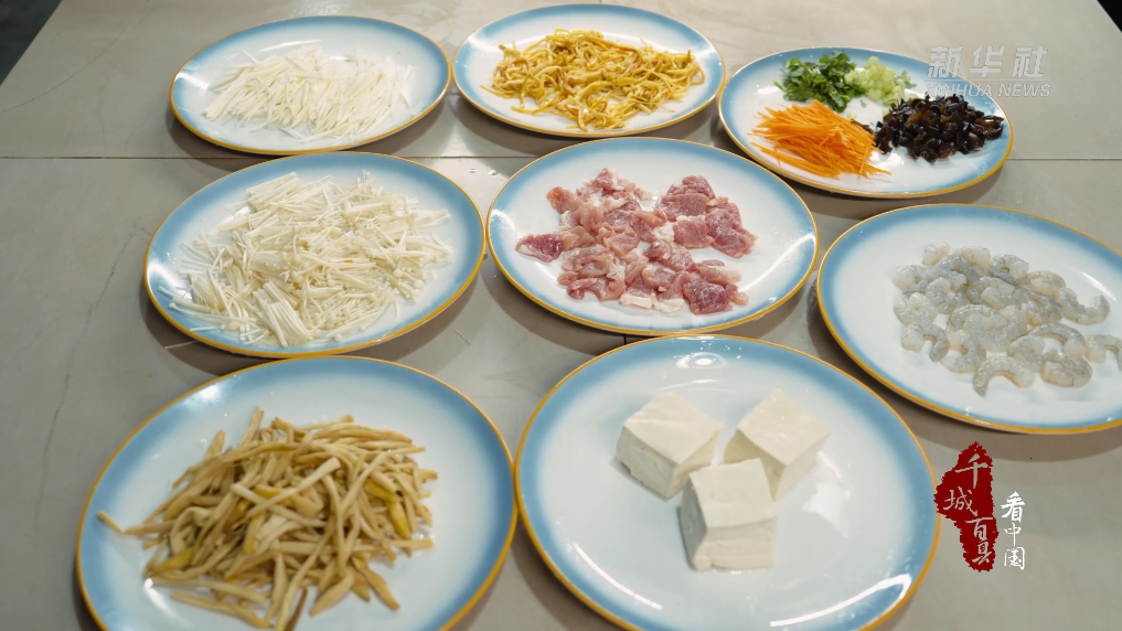 在福建省泉州市洛江区,这道菜在传统做法上因地制宜进行了创新和改良。将淮山药、老豆腐切成丝状,与黄花菜、金针菇、木耳、芹菜、虾仁、瘦肉等在煮沸的汤中混合,再勾芡使汤汁更加浓郁,菌菇、虾仁与肉的鲜味更是相得益彰。一碗七宝羹,不仅是对中华传统饮食文化的传承,也诠释着当地人独特的舌尖智慧。
