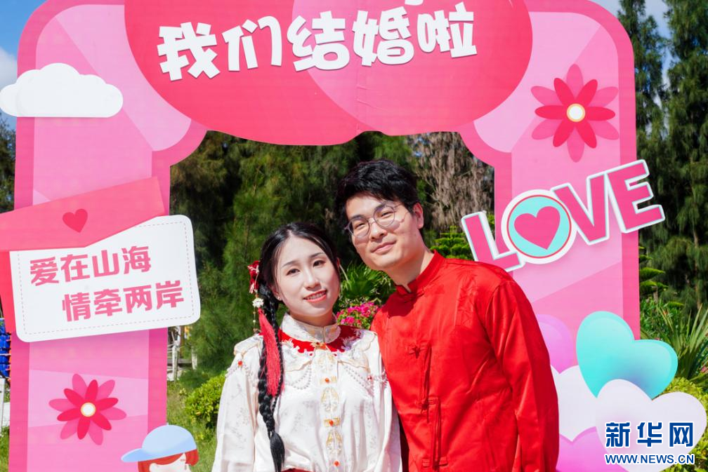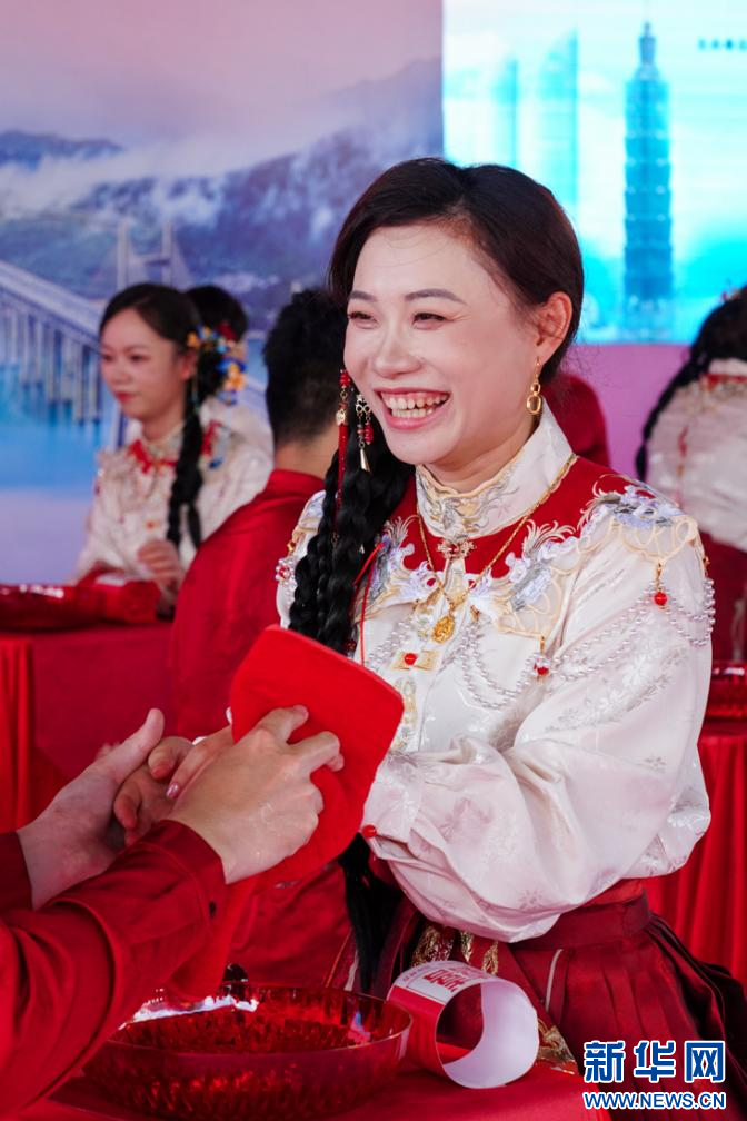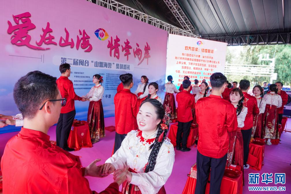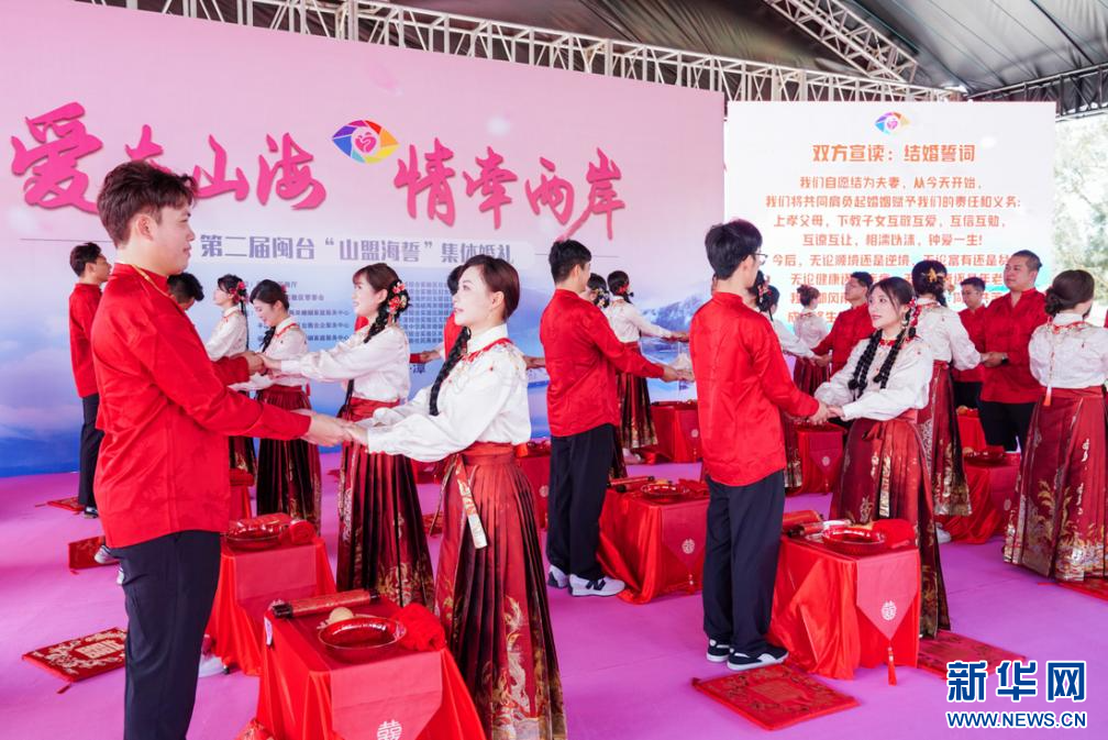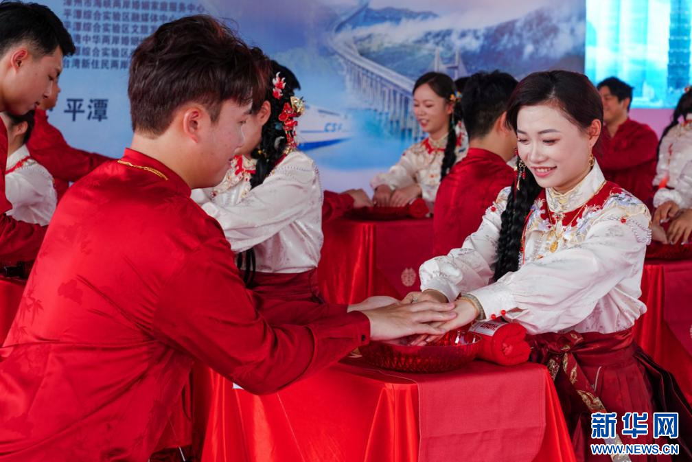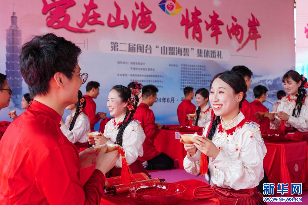 6月29日,福建平潭,旭日和风。主题为“爱在山海 情牵两岸”的第二届闽台“山盟海誓”集体婚礼如期举办。20对闽台新人在此间手牵红绣球,漫步红地毯,依照传统婚俗,渐次行沃盥之礼、合卺之礼、婚书之礼和夫妻对拜,结下跨越海峡的美好姻缘,共赴新生活、新未来。