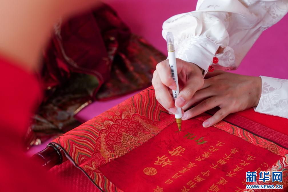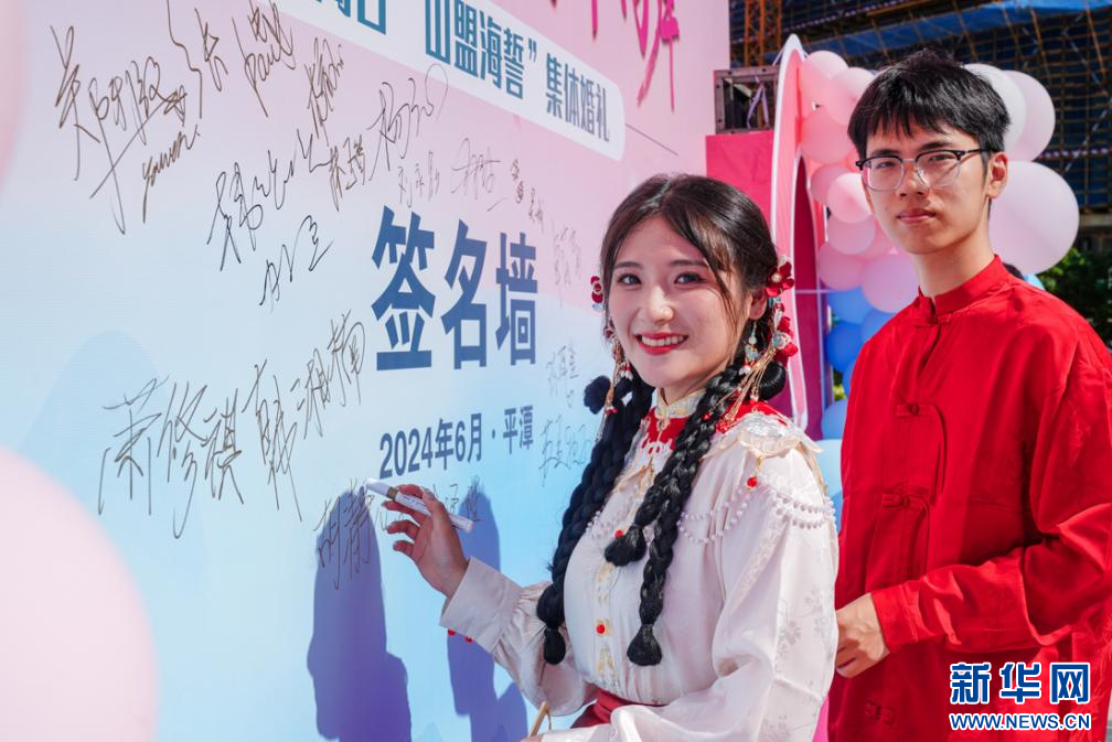 一对新人在签名墙处合影。新华网 肖和勇 摄