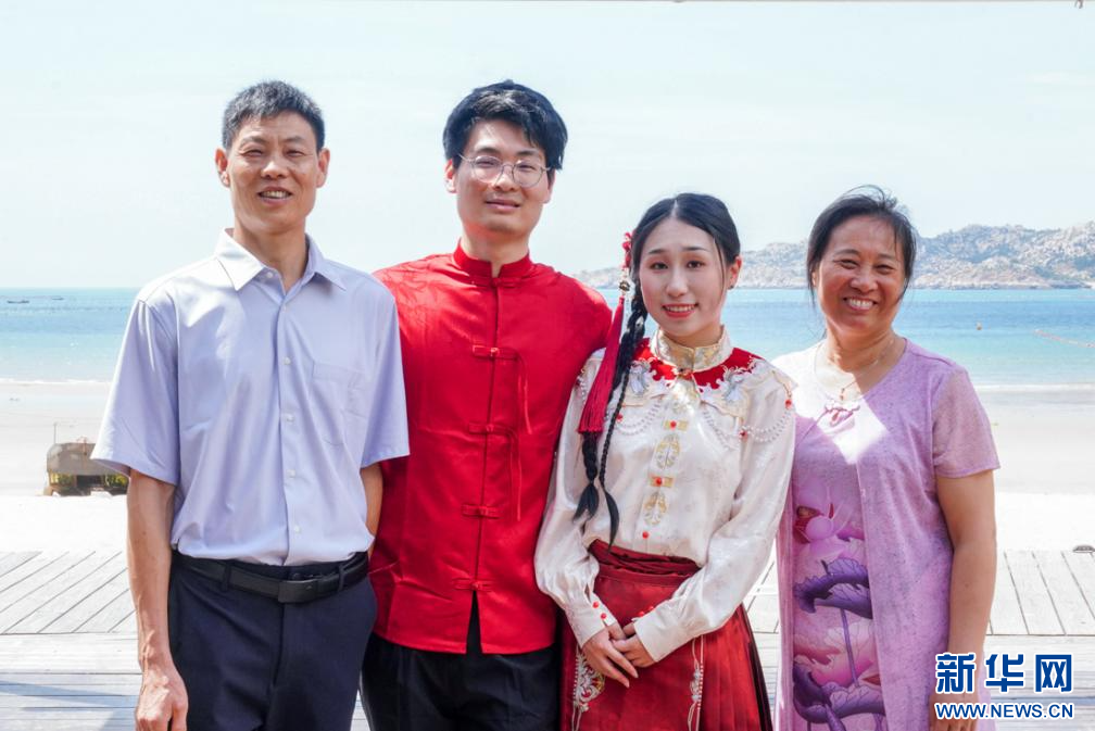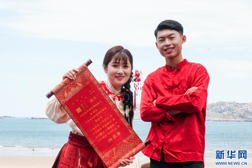新人在海边展示婚书,留下美好纪念。新华网 肖和勇 摄