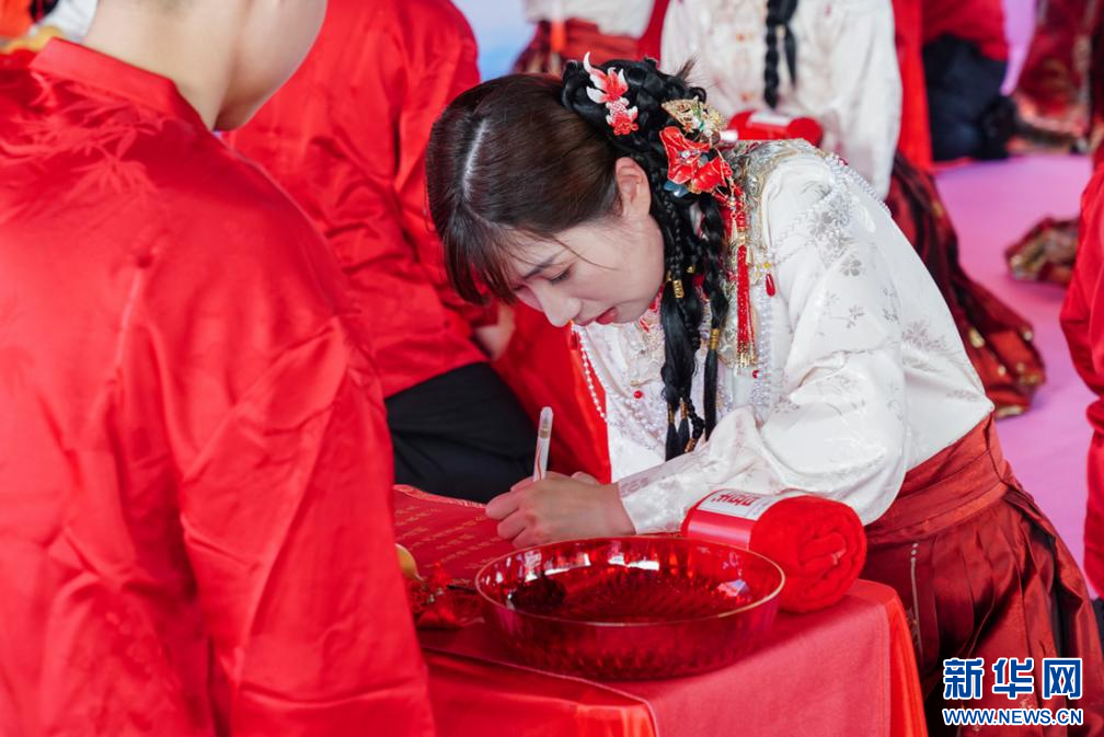 新人在集体婚礼上一起宣读《结婚誓词》。新华网 肖和勇 摄