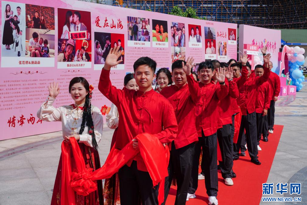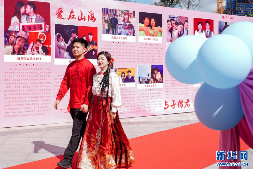 一对新人牵手走过红地毯。新华网 肖和勇 摄