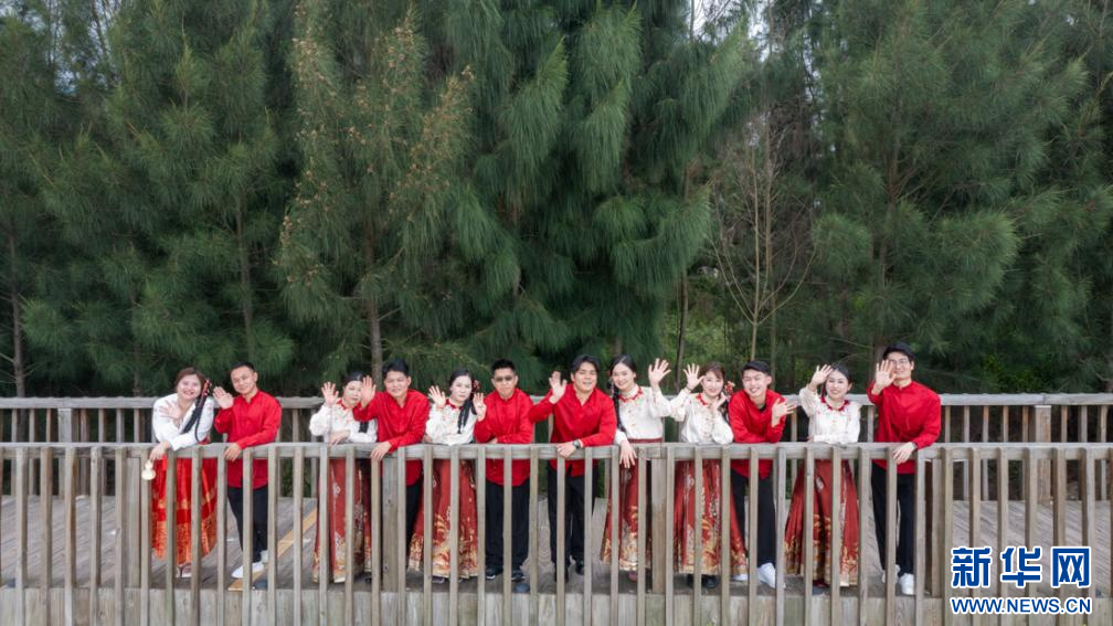 礼成之后,新人在景点附近木栈道上打卡散步(无人机照片)。新华网 肖和勇 摄