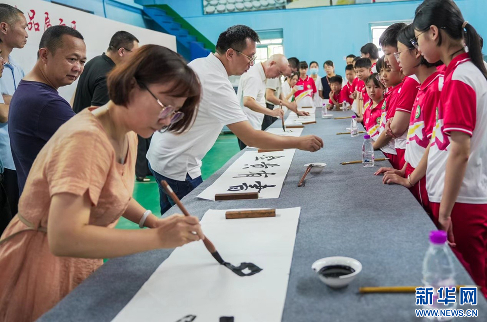 书法家们向孩子们示范书法。新华网发(受访者供图)