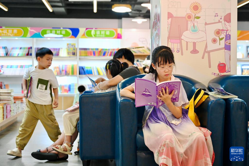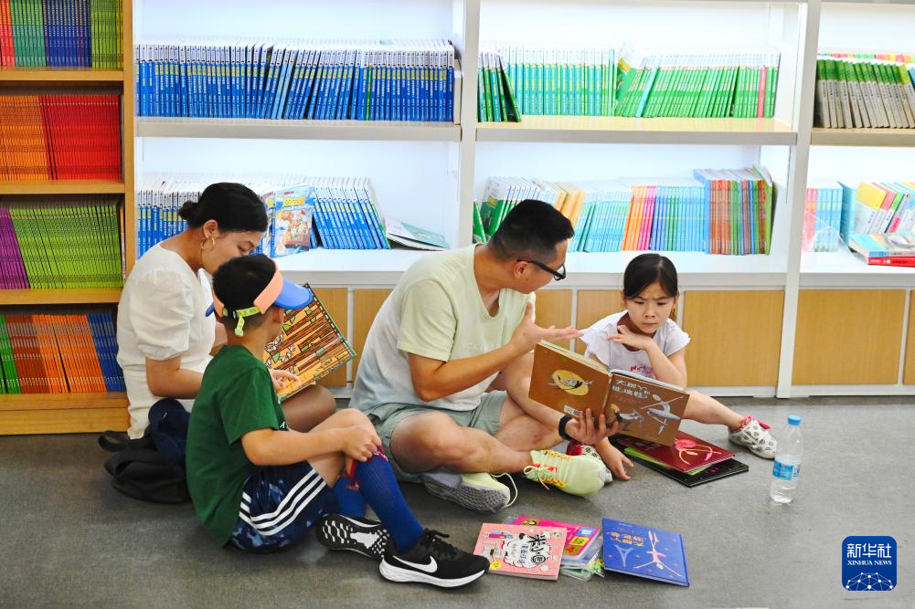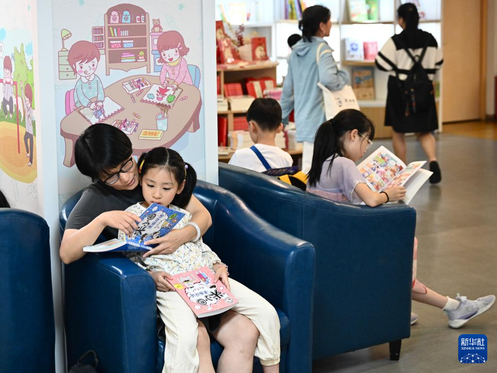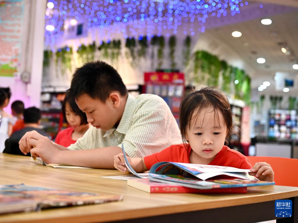 7月6日,福州新华书店鳌峰坊书城内家长陪伴孩子读书纳凉。新华社记者 姜克红 摄