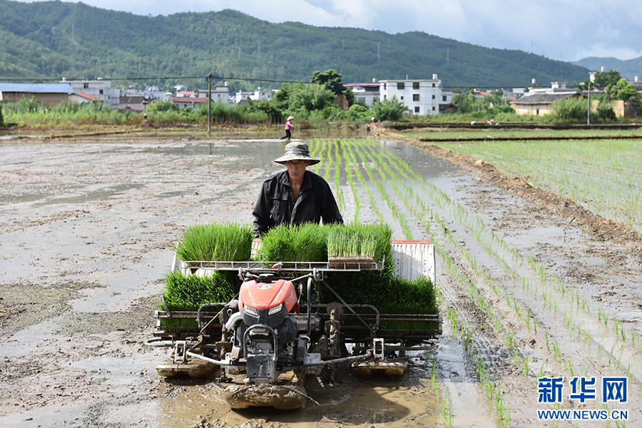 近日,龙岩市上杭县庐丰畲族乡迎来了水稻种植期。图为农民在插秧机上工作。新华网发(郭子雄 摄)