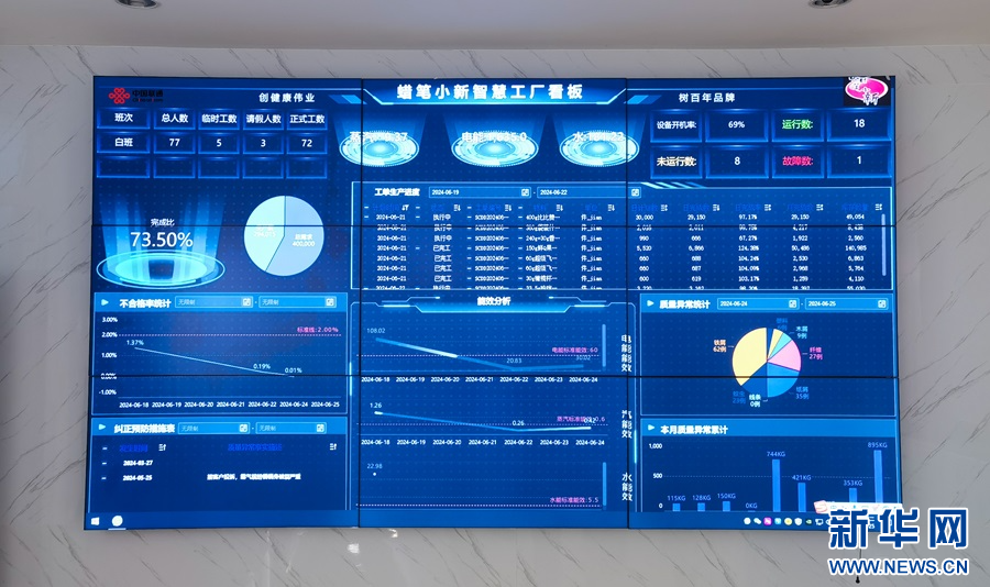 在蜡笔小新控制中心的智慧大屏上,生产进度、产品库存、质量情况等实时数据一目了然。新华网 刘丰 摄
