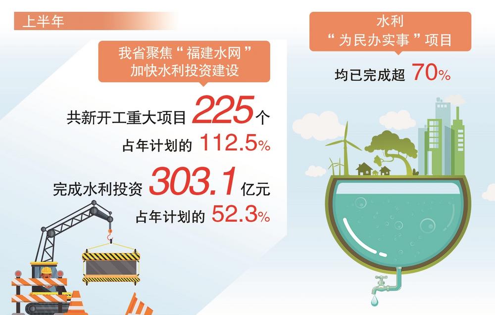 上半年,泉州白濑水库进入施工高峰期,完成投资7亿元、占年计划的51.4%;霍口水库下闸蓄水;全省新开工4座中型、6座小型水库,在建中小型水库完成投资14.29亿元;宁德上白石项目可研、移民安置大纲通过审查……福建“大水缸”加快建设。