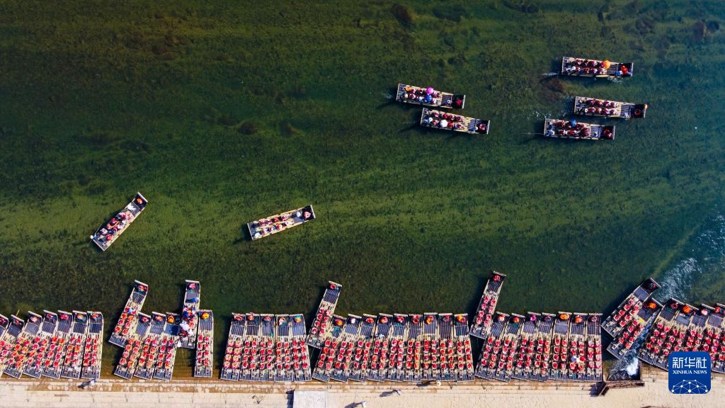 这是位于星村镇的武夷山九曲溪竹筏码头(7月10日摄,无人机照片)。这里曾经是载运武夷贡茶的古码头。新华社发(陈颖 摄)
