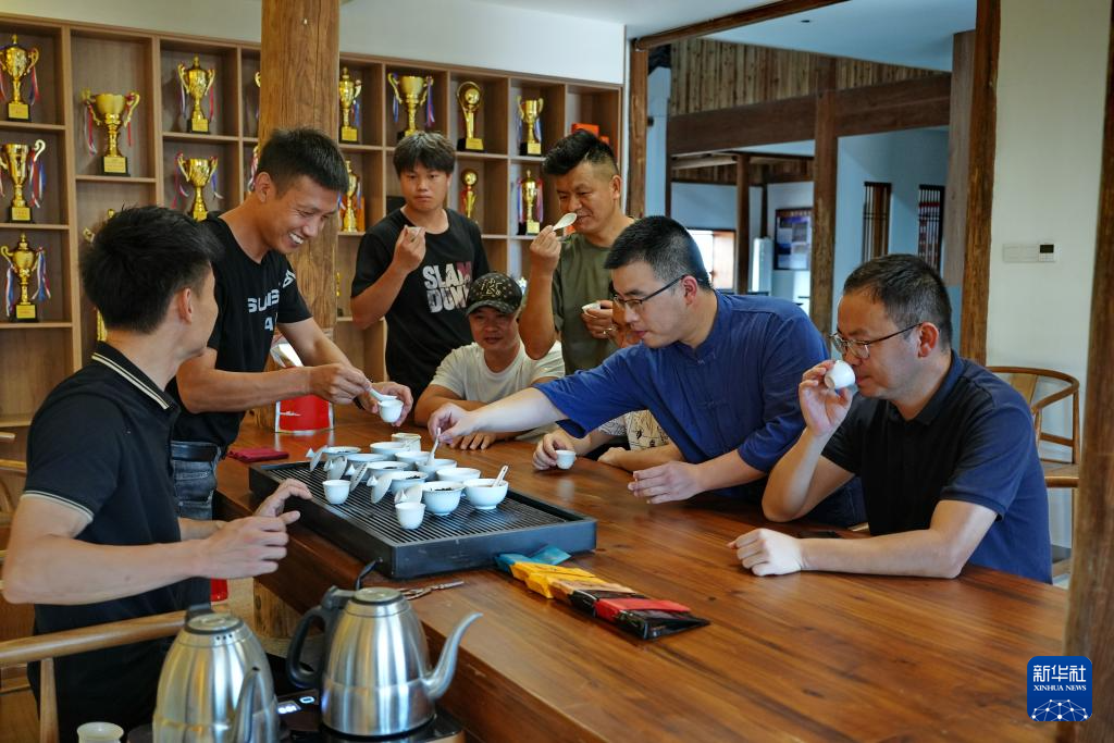 星村镇年轻茶农在一起品鉴自己制作的新茶,相互交流制茶经验(7月10日摄)。新华社发(陈颖 摄)