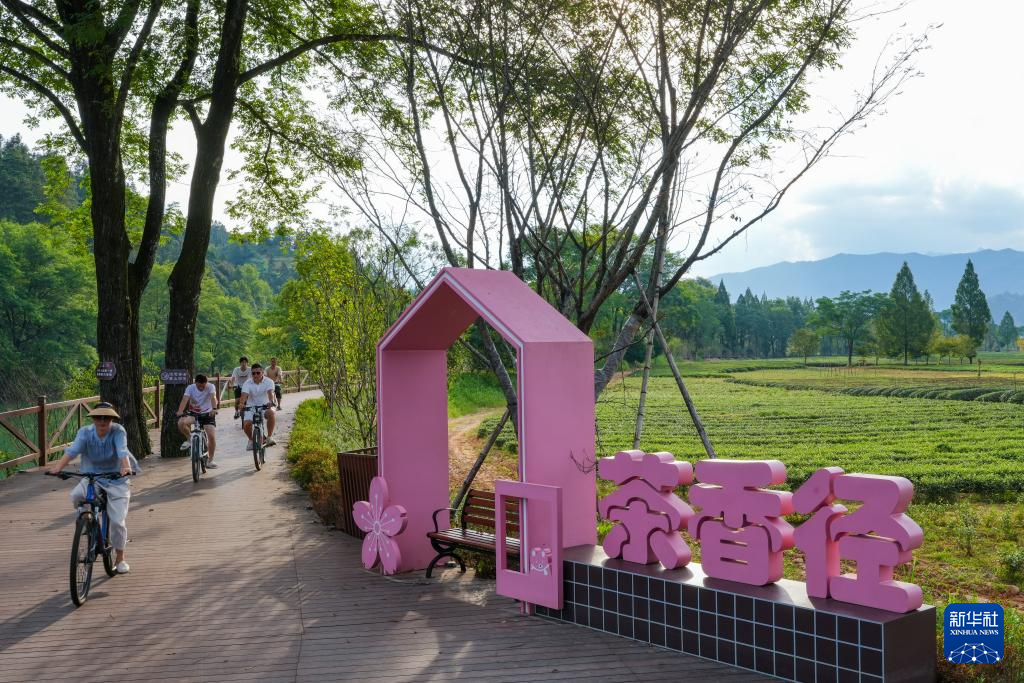 7月11日,游人在星村镇生态观光茶园内骑行。新华社发(陈颖 摄)