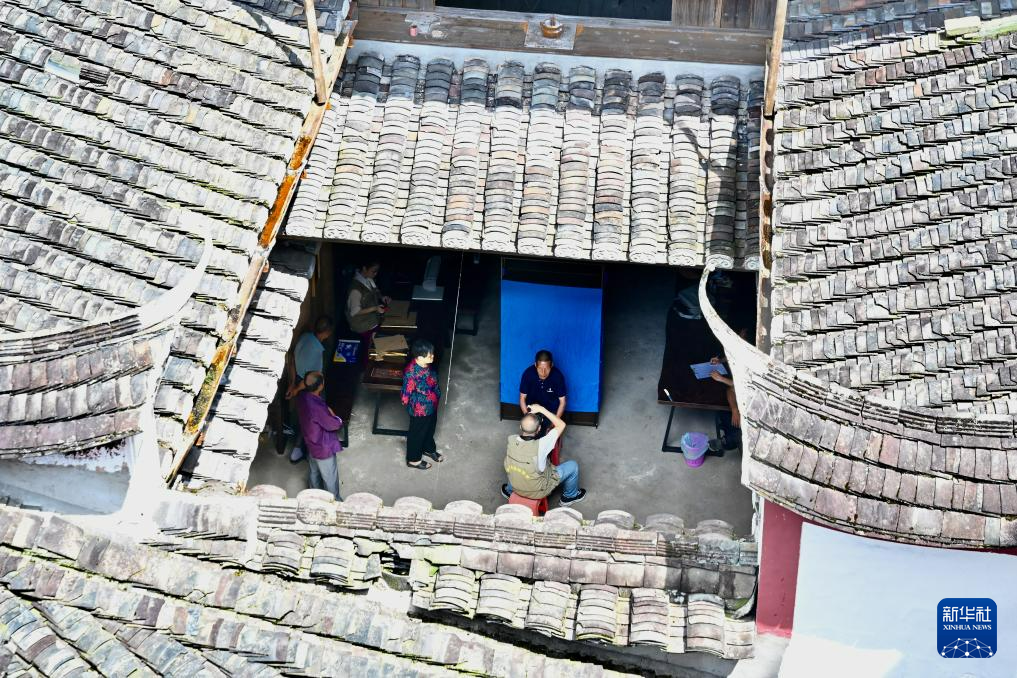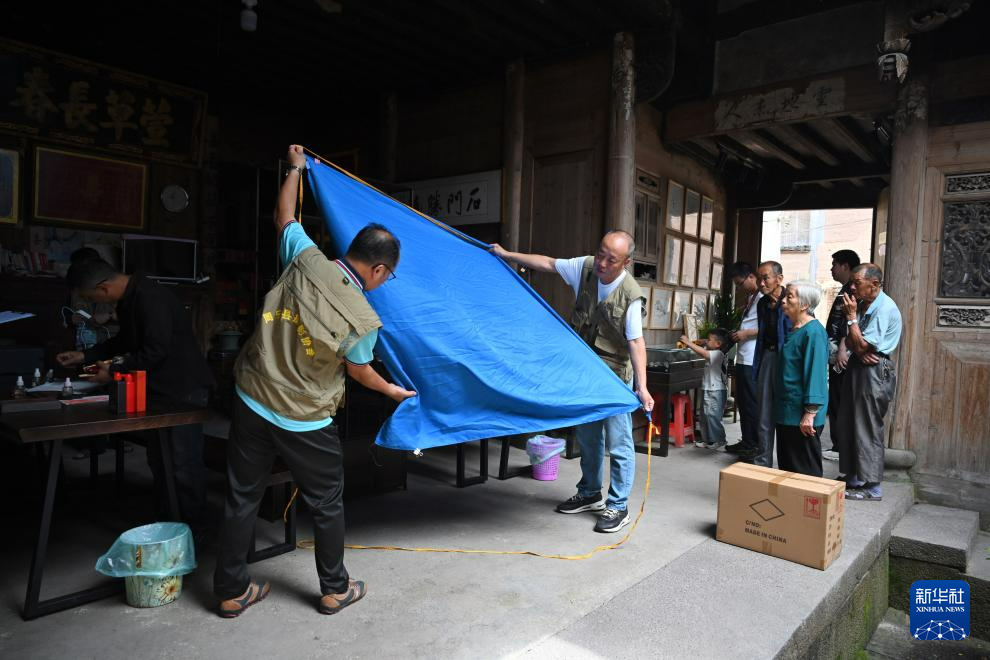 7月13日,周宁县敬老摄影志愿者在李墩镇楼坪村一老屋内布置肖像摄影背景布。 新华社记者 姜克红 摄