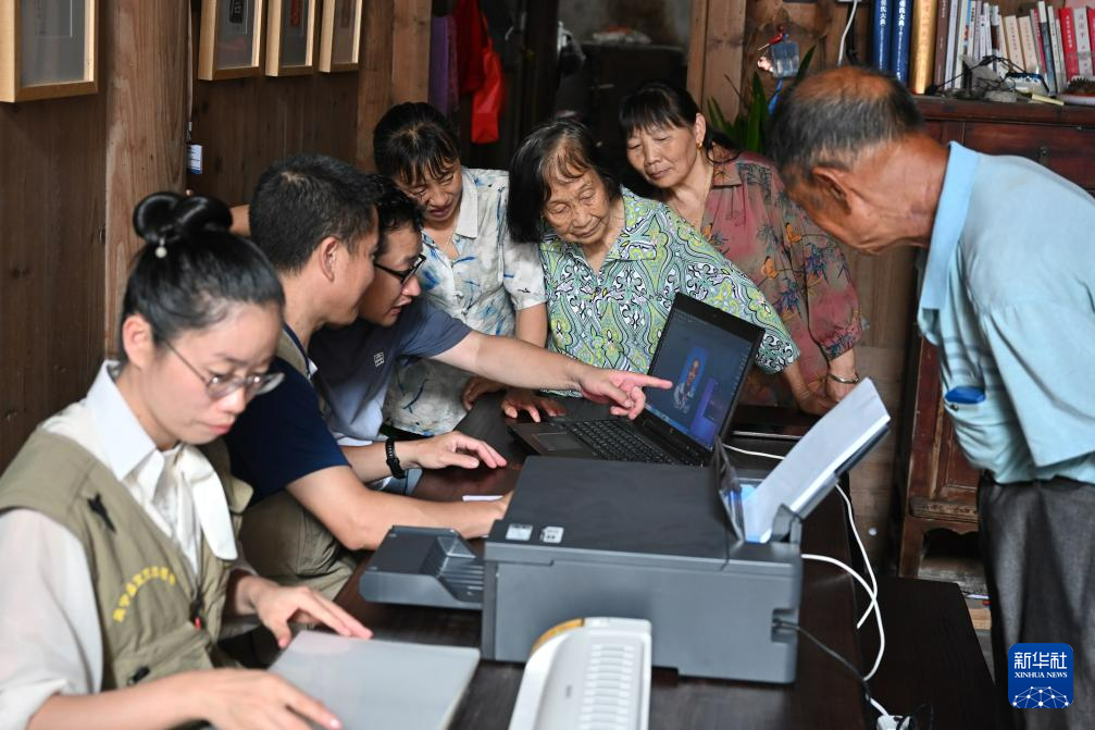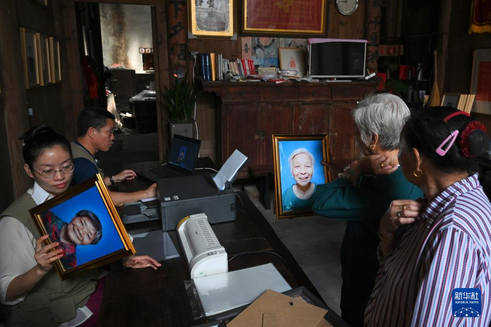 7月13日,在周宁县李墩镇楼坪村,敬老摄影志愿者(左)现场把拍摄的肖像照打印、塑封、装框,一旁老人在观看自己的照片。 新华社记者 姜克红 摄