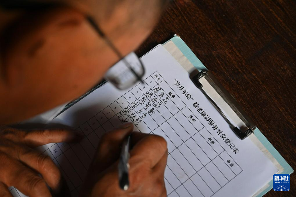 7月13日,周宁县李墩镇楼坪村一位村干部在为拍摄肖像照的老人做登记。 新华社记者 姜克红 摄