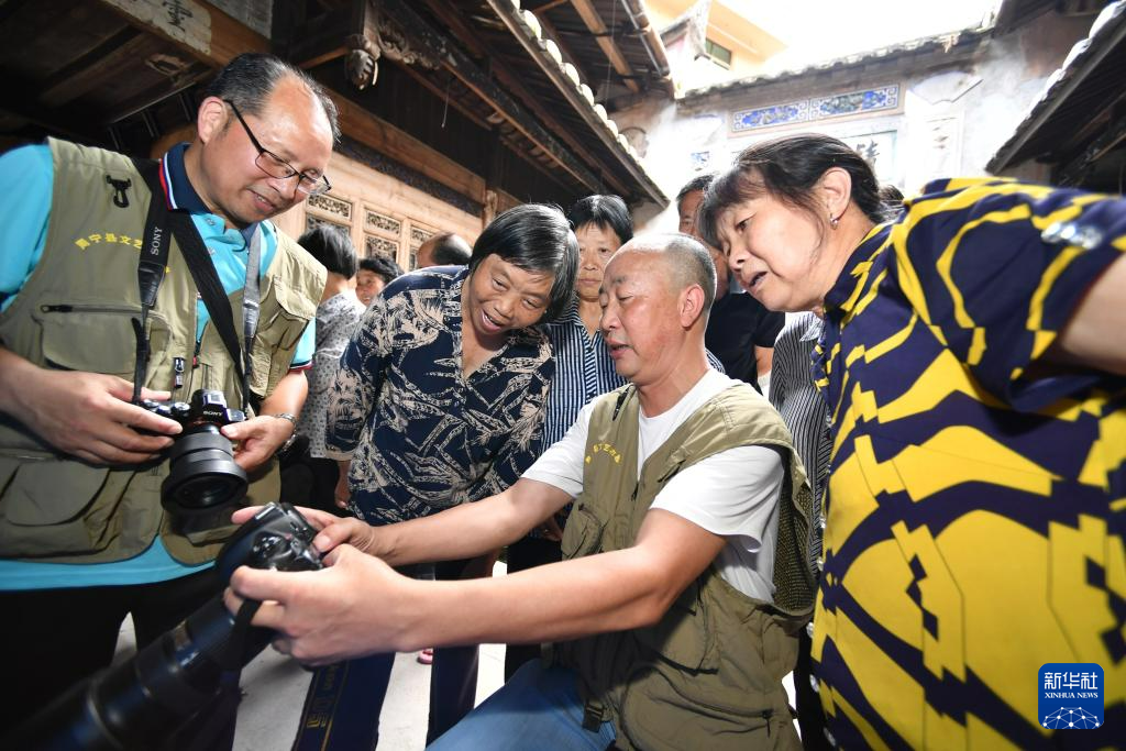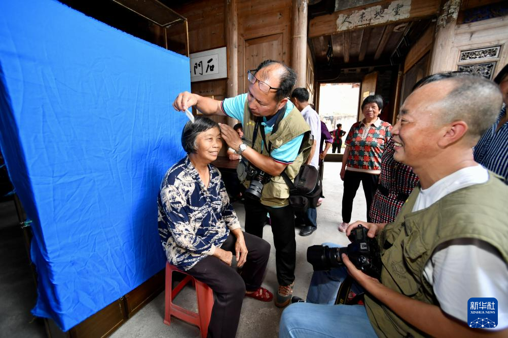 7月13日,周宁县敬老摄影志愿者在李墩镇楼坪村为老人拍摄肖像照。 新华社记者 姜克红 摄
