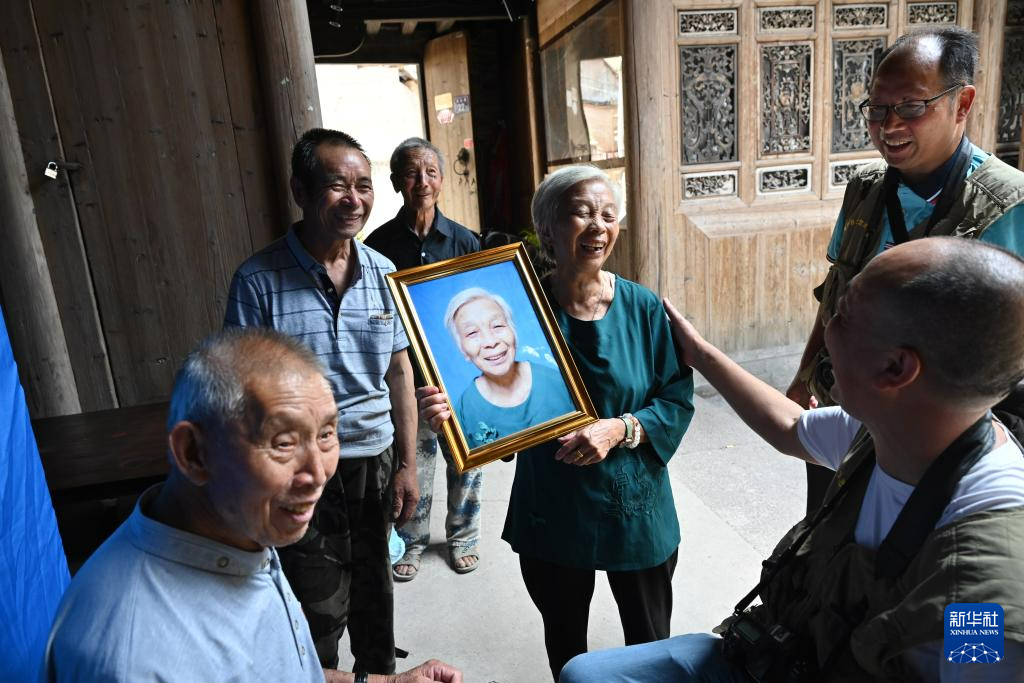 7月13日,在周宁县李墩镇楼坪村,一位拿到肖像照的老人现场向敬老摄影志愿者表示感谢。 新华社记者 姜克红 摄