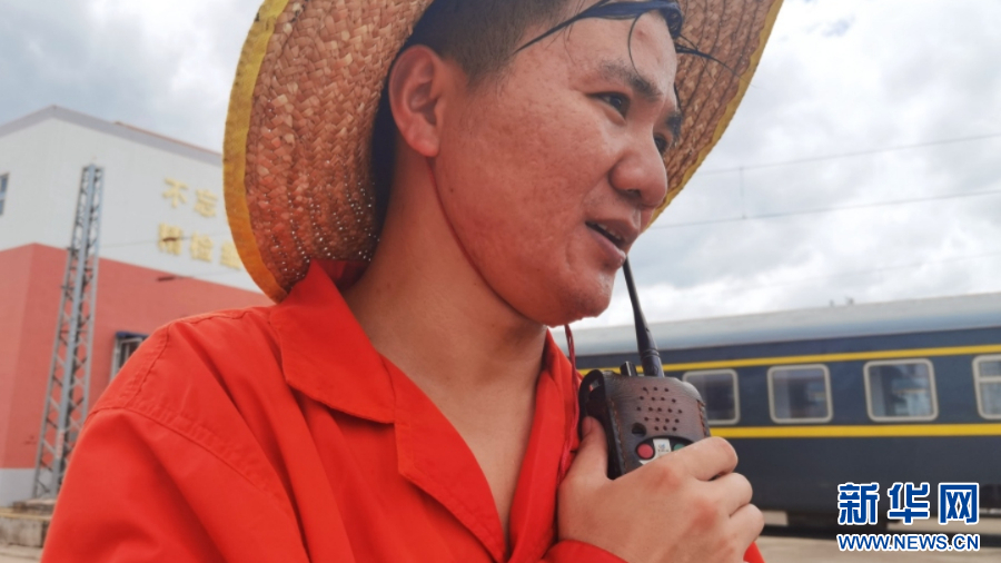 调车员通过对讲机指挥列车进路,保障铁路运输安全正点。新华网发(万宇 摄)