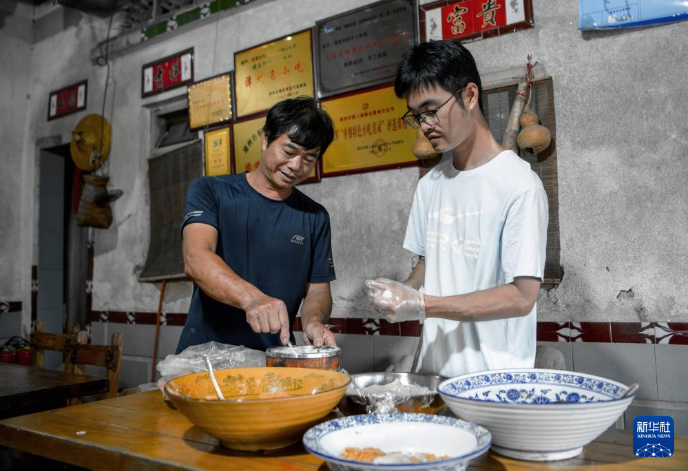这是埭美村村民陈志平(右)跟父亲一起制作麻糍(7月10日摄)。2016年,大学毕业的他返乡创业,接手家传手艺,同时还致力于乡土文化的宣传。新华社记者 魏培全 摄
