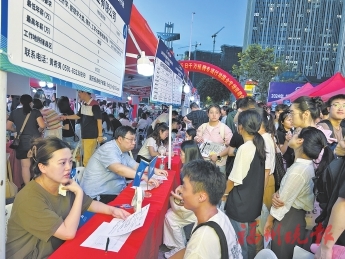 昨日19时许,在宝龙城市广场,由市人社局、市国资委等单位联合举办的“好年华 聚福州”百日千万招聘专项行动国企专场招聘会火热“出摊”。这场专门针对高校毕业生的夜间招聘会,避开了白天的炎炎烈日,让高校毕业生在晚风中寻找心仪的岗位。