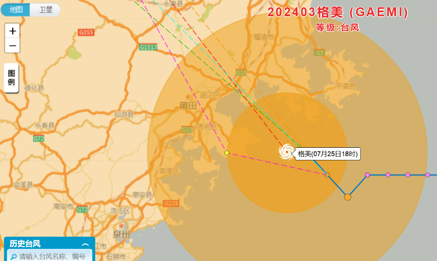 中央气象台预报,“格美”25日17时中心位于福建省福清市南偏东方向大约60公里的台湾海峡海面上,预计将以每小时10—15公里的速度向西偏北方向移动,即将在福建秀屿到福清一带沿海登陆(台风级,12级,33—35米/秒)。