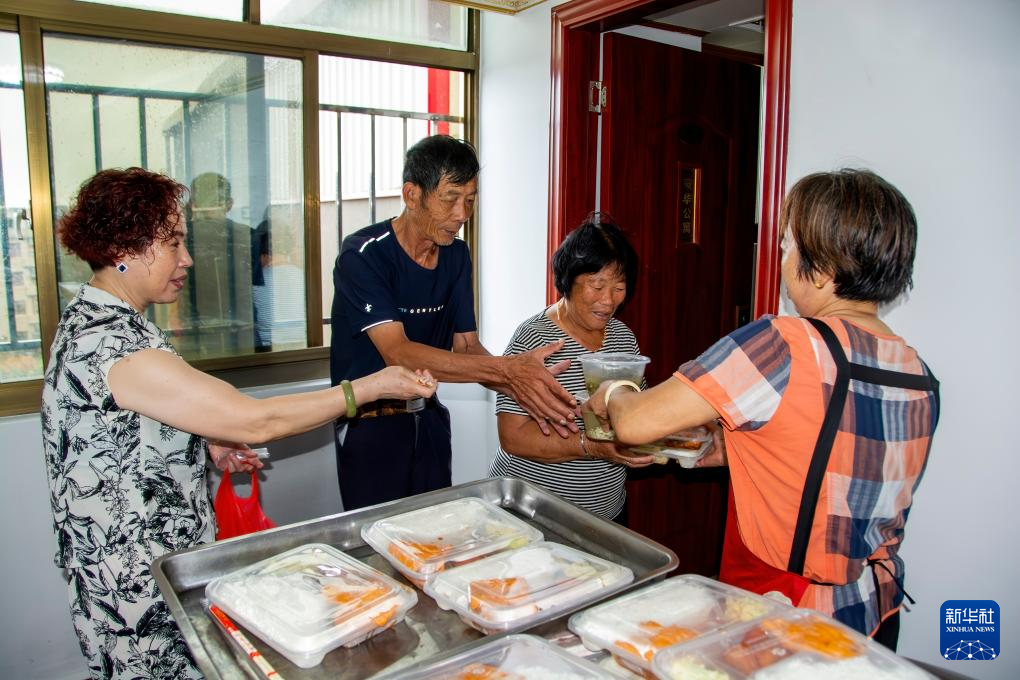 7月25日,在福清市江阴镇的一处转移安置酒店里,工作人员为转移安置群众(右二、右三)送上热乎乎的晚餐。
