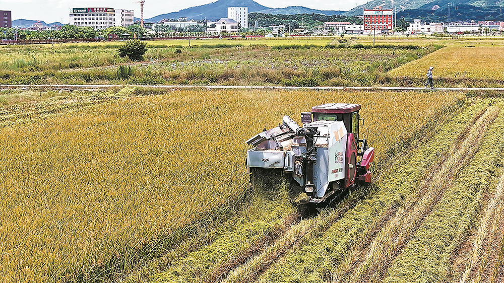 在福清市海口镇南厝村,早稻陆续进入成熟期。为降低台风“格美”可能带来的不利影响,农户开镰收割忙抢收。卞军凯 薛晓娟 郭城 摄