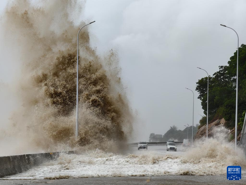 7月25日,福建省宁德市霞浦县三沙镇沿海出现巨浪,防台人员现场指挥滞留车辆尽快撤离至安全区域。