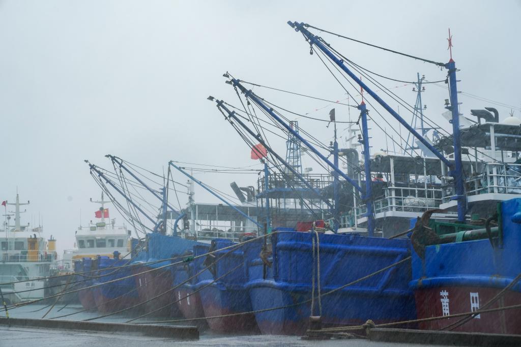 7月25日下午,在位于福建省莆田市秀屿区埭头镇的石城国家一级渔港,今年第3号台风“格美”的外围风圈已经袭来。七八级的阵风夹杂着豆大的雨点打在脸上,裹挟着三四米高的海浪拍击着护堤,激起白茫茫一片水花。渔港里,100多艘大小船舶已在24日中午12点前回港,呈“半月环抱”状整齐停泊,船舶间已用缆绳加固。