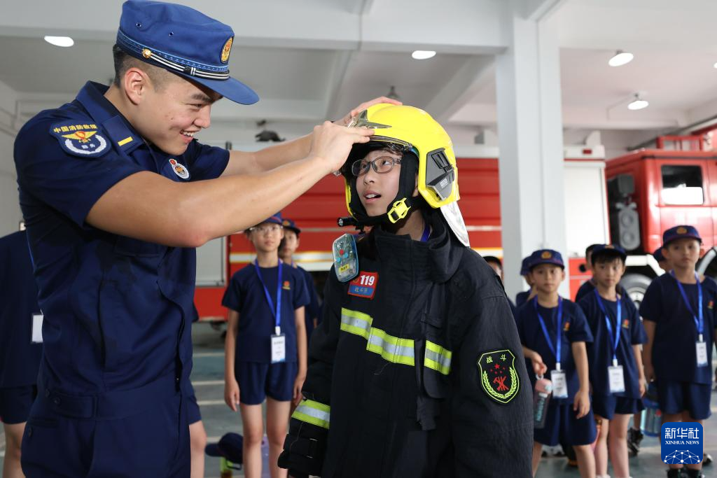 7月29日,在福建省厦门市海沧区消防救援大队,小学生在消防员的帮助下体验穿戴灭火防护装备。新华社发(曾德猛 摄)