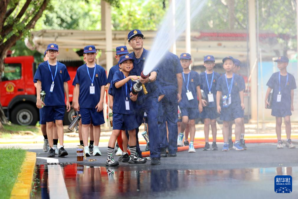 7月29日,在福建省厦门市海沧区消防救援大队,小学生在消防员的指导下体验手持水枪“灭火”。
