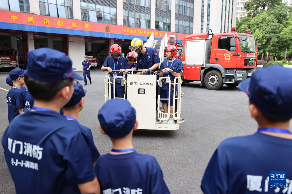 7月29日,在福建省厦门市海沧区消防救援大队,小学生在消防员的指导下体验乘坐消防云梯车。新华社发(曾德猛 摄)