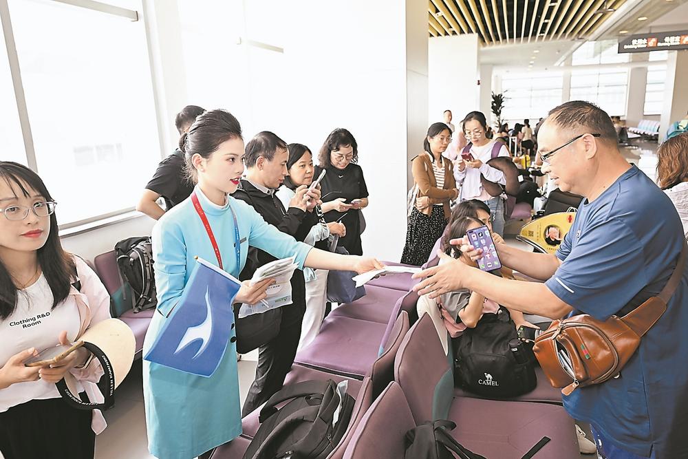 厦航地服工作人员为“厦门—马累”航线旅客发放手机防水袋与钥匙扣伴手礼。