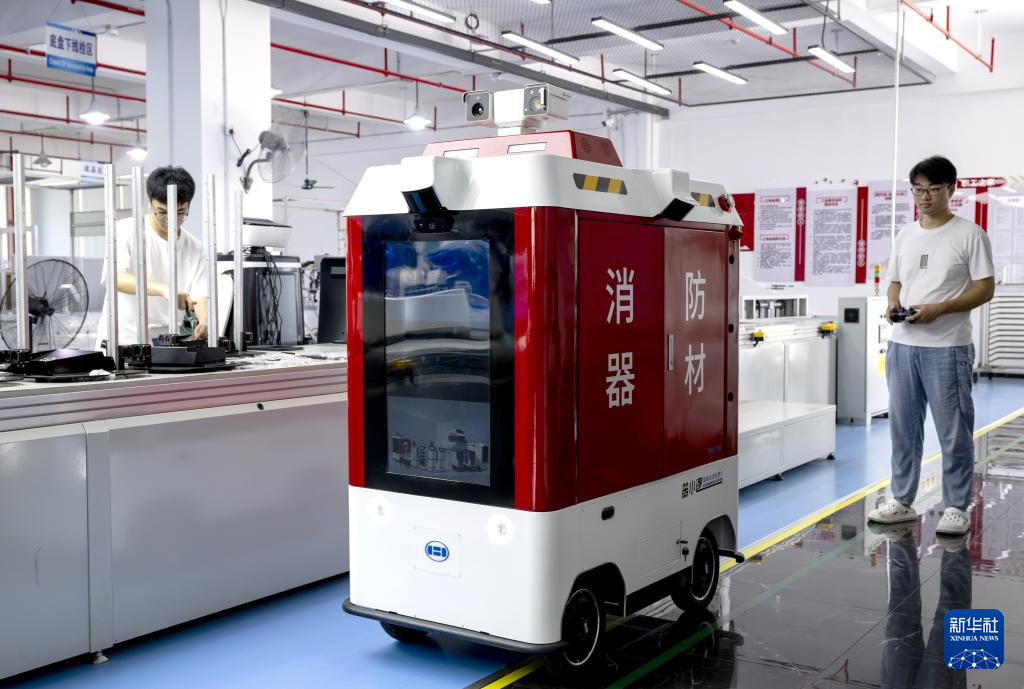 8月1日,技术人员在福建汉特云智能科技有限公司生产线上调试消防智能巡逻机器人。新华社记者 魏培全 摄