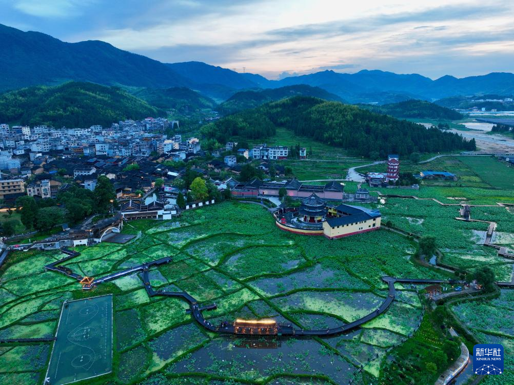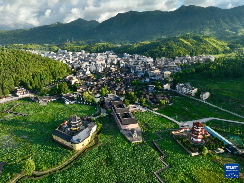这是7月12日拍摄的浦源村百亩荷花塘及村内古建筑群(无人机照片)。新华社记者 姜克红 摄