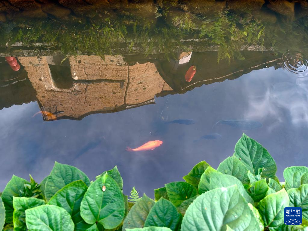 7月14日,浦源村鲤鱼溪内的鲤鱼与古民居倒影相映成趣。新华社记者 姜克红 摄