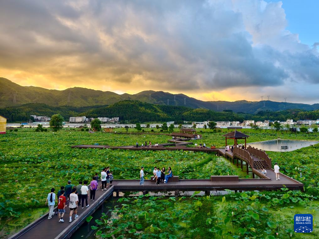 7月29日,游客在浦源村鲤鱼溪景区游览百亩荷塘。新华社记者 姜克红 摄