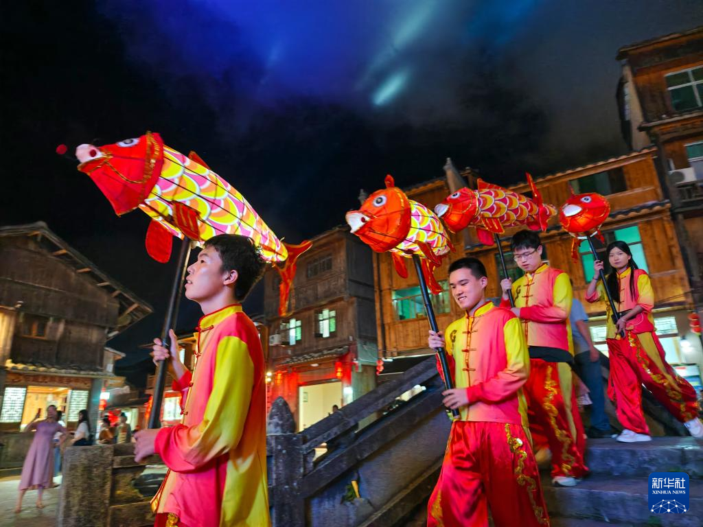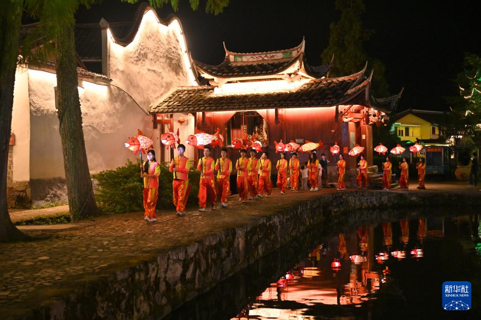 浦源村鲤鱼溪景区内进行的鲤鱼灯习俗表演(7月29日摄)。新华社记者 姜克红 摄