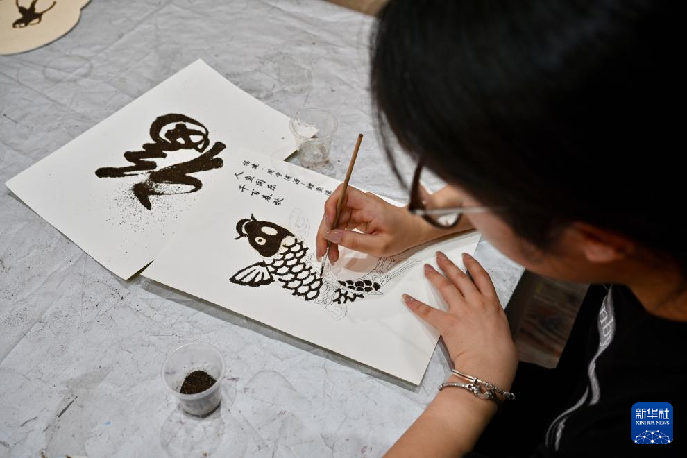 7月14日,浦源村鲤鱼溪画院内一位女孩在描绘鲤鱼画作。新华社记者 姜克红 摄