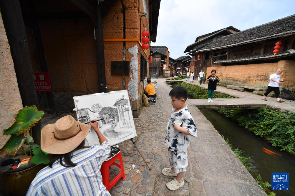 7月14日,浦源村鲤鱼溪景区内一位男孩在欣赏画家写生。新华社记者 姜克红 摄