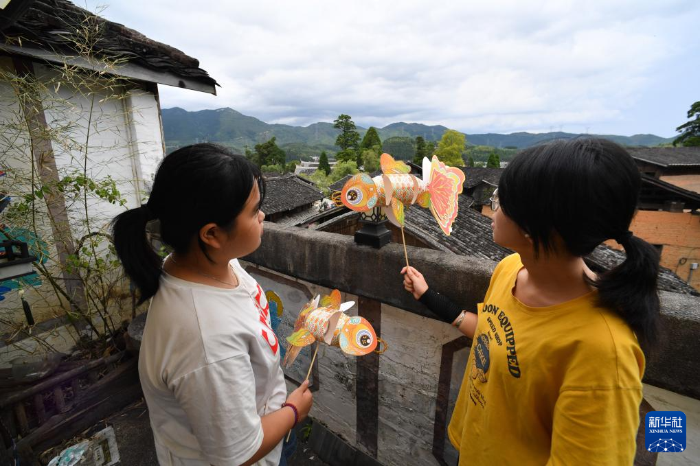 7月14日,浦源村鲤鱼溪画院内两位在此研学的大学生展示手工制作的鲤鱼灯。新华社记者 姜克红 摄