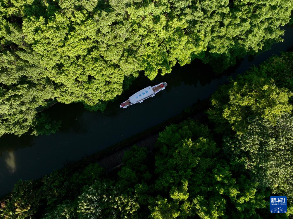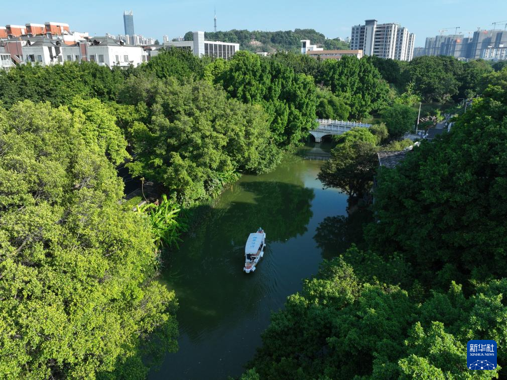 8月7日,游船在福州白马河上行驶(无人机照片)。新华社记者 姜克红 摄
