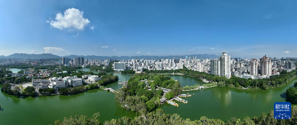 这是8月7日拍摄的福州西湖及周边城市景观(无人机全景照片)。新华社记者 姜克红 摄