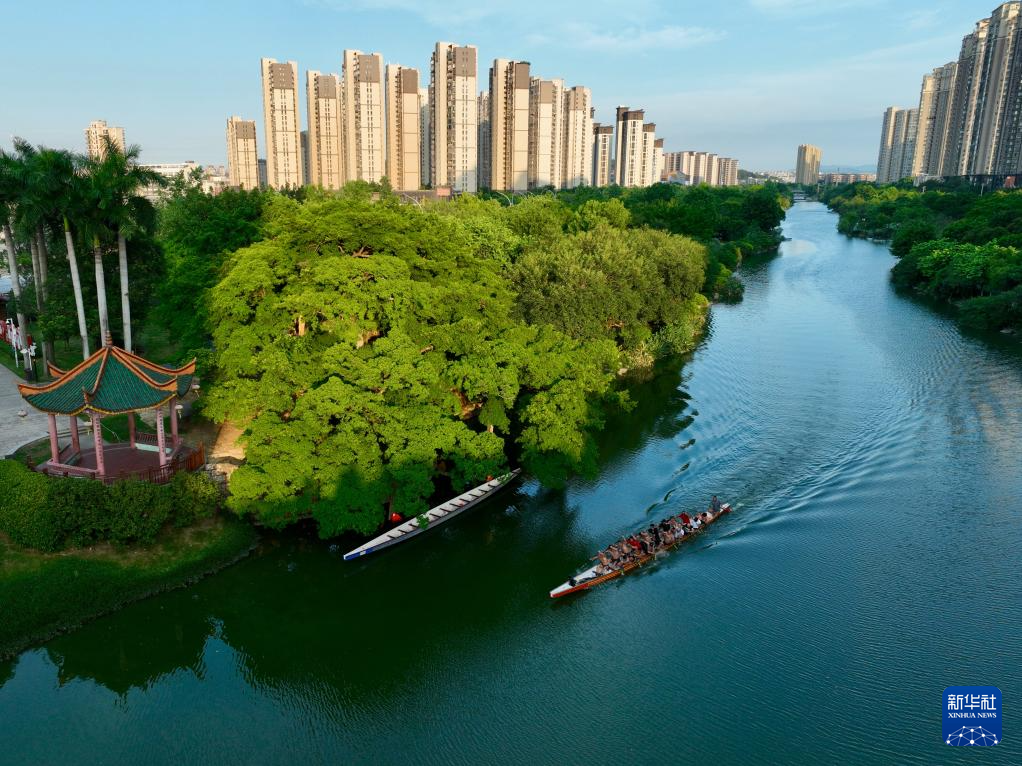 8月6日,龙舟爱好者在福州流花溪上划龙舟(无人机照片)。