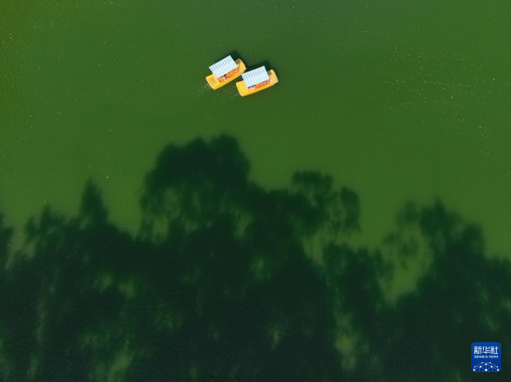8月7日,两艘游船在福州西湖上行驶(无人机照片)。新华社记者 姜克红 摄