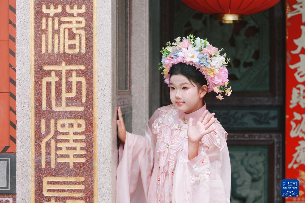 8月8日,头戴簪花的小朋友在福建省泉州市蟳埔村拍照留影。新华社记者 陈为 摄