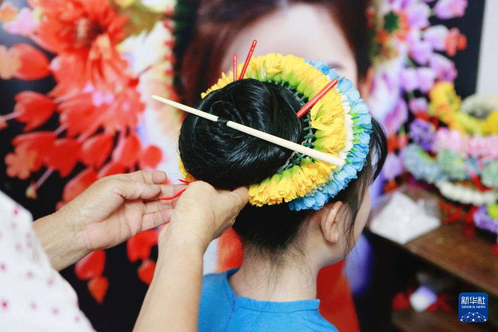 8月8日,福建省泉州市蟳埔村村民为游客簪花。新华社记者 陈为 摄