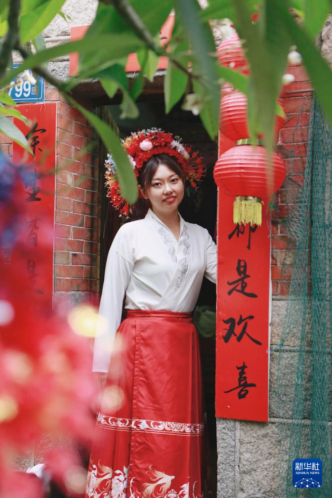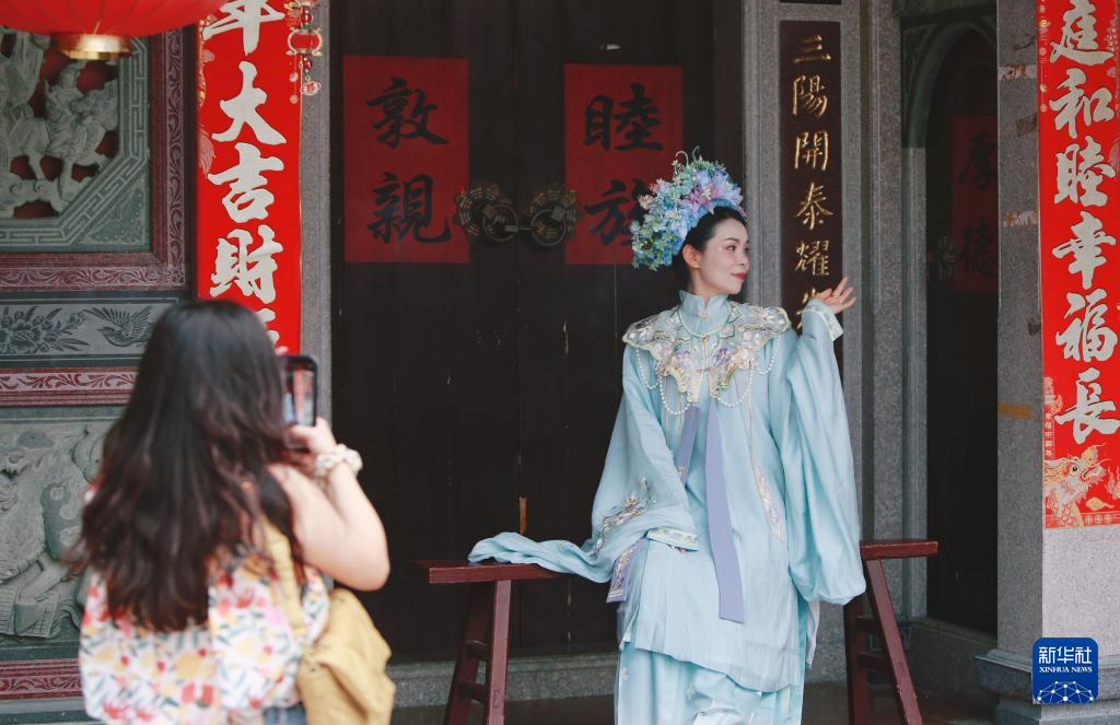 8月8日,头戴簪花的游客在福建省泉州市蟳埔村拍照留影。新华社记者 陈为 摄
