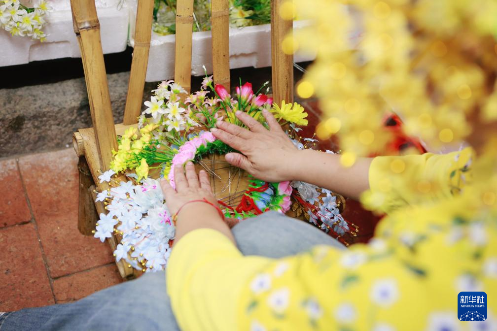 8月8日,福建省泉州市蟳埔村村民在挑选簪花。新华社记者 陈为 摄