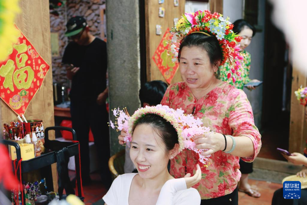 8月8日,福建省泉州市蟳埔村村民为游客簪花。